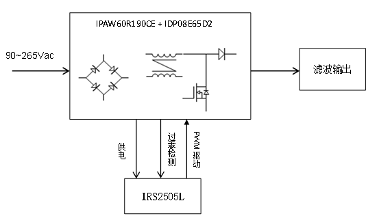 本參考設計采用了infineon的IRS2505L作為控制芯片,infineon的性價比高的CoolMOS CE系列MOS管做功率轉換。IRS2505L采用臨界導通模式(CrCM)運行,開關損耗低;雖然采用了SOT23-5封裝,比傳統的SO8封裝小70%,但集成了電壓反饋回路、輸出電壓調節、智能過零檢測、直流輸出過壓保護和逐周期過流保護等功能,廣泛應用在電源、電子鎮流器、LED驅動等領域上。CoolMOS CE系列MOSFET,是infineon針對消費類電子產品而優化的高壓超級結MOSFET,電壓覆蓋500V/600V/650V/700V/800V等,性價比高,特別適合適配器、LCD、LED電視、LED照明和電動工具等的應用。