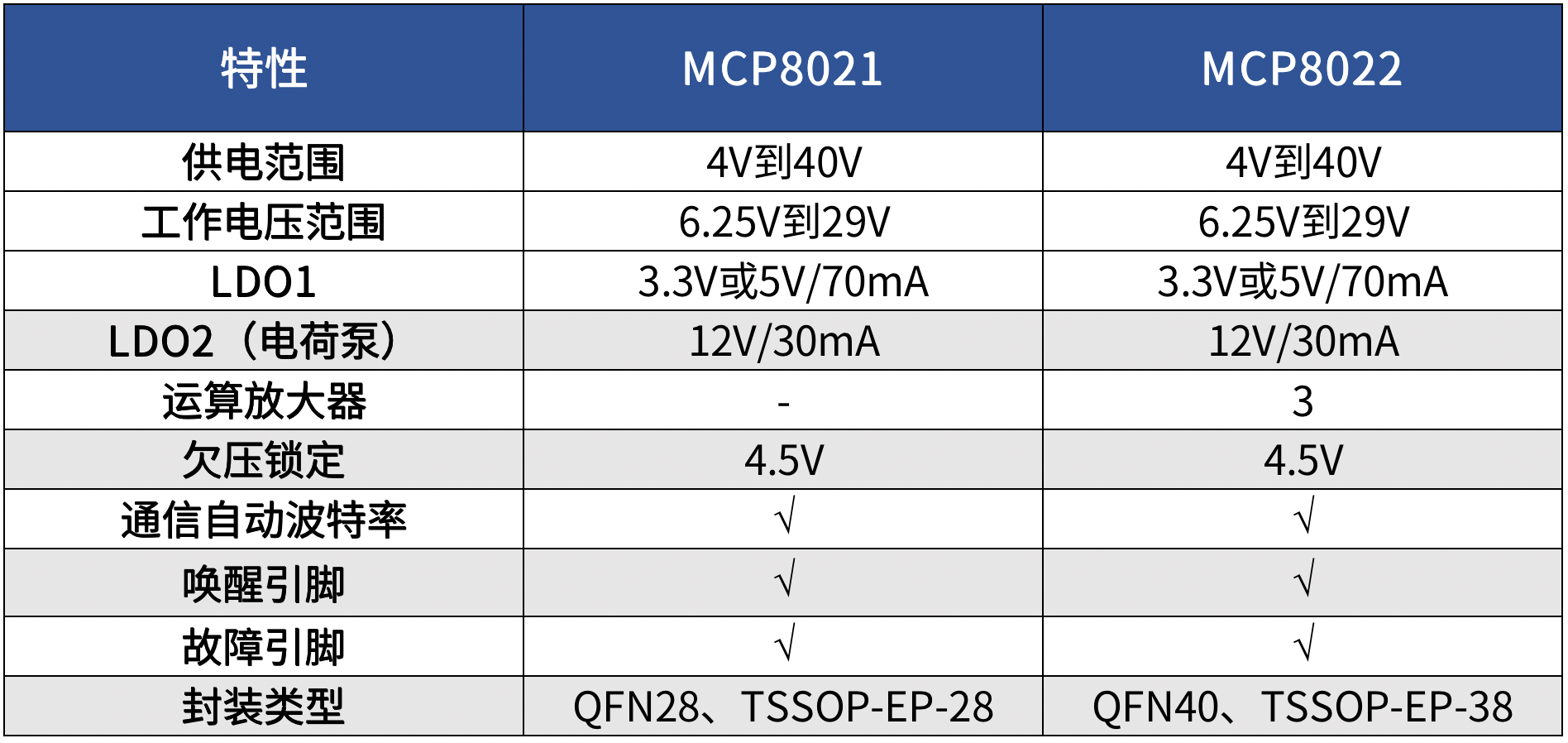 ○ MCP8021的封裝:28引腳5x5mmVQFN和28引腳TSSOP-EP