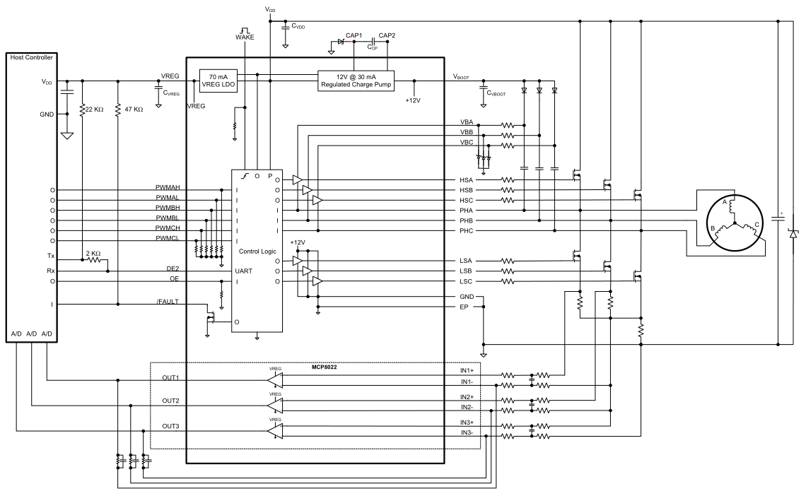 MCP8021/2器件集成了3.3V或5.0V LDO,能夠提供70 mA的電流,可為配套單片機供電;還集成了過溫傳感器和用戶可配置功能,可配置死區時間、消隱時間,使能/禁止在待機期間運放、睡眠模式、過流檢測和欠壓保護等功能。除此之外,MCP8022器件還增加了三個獨立的運算放大器。