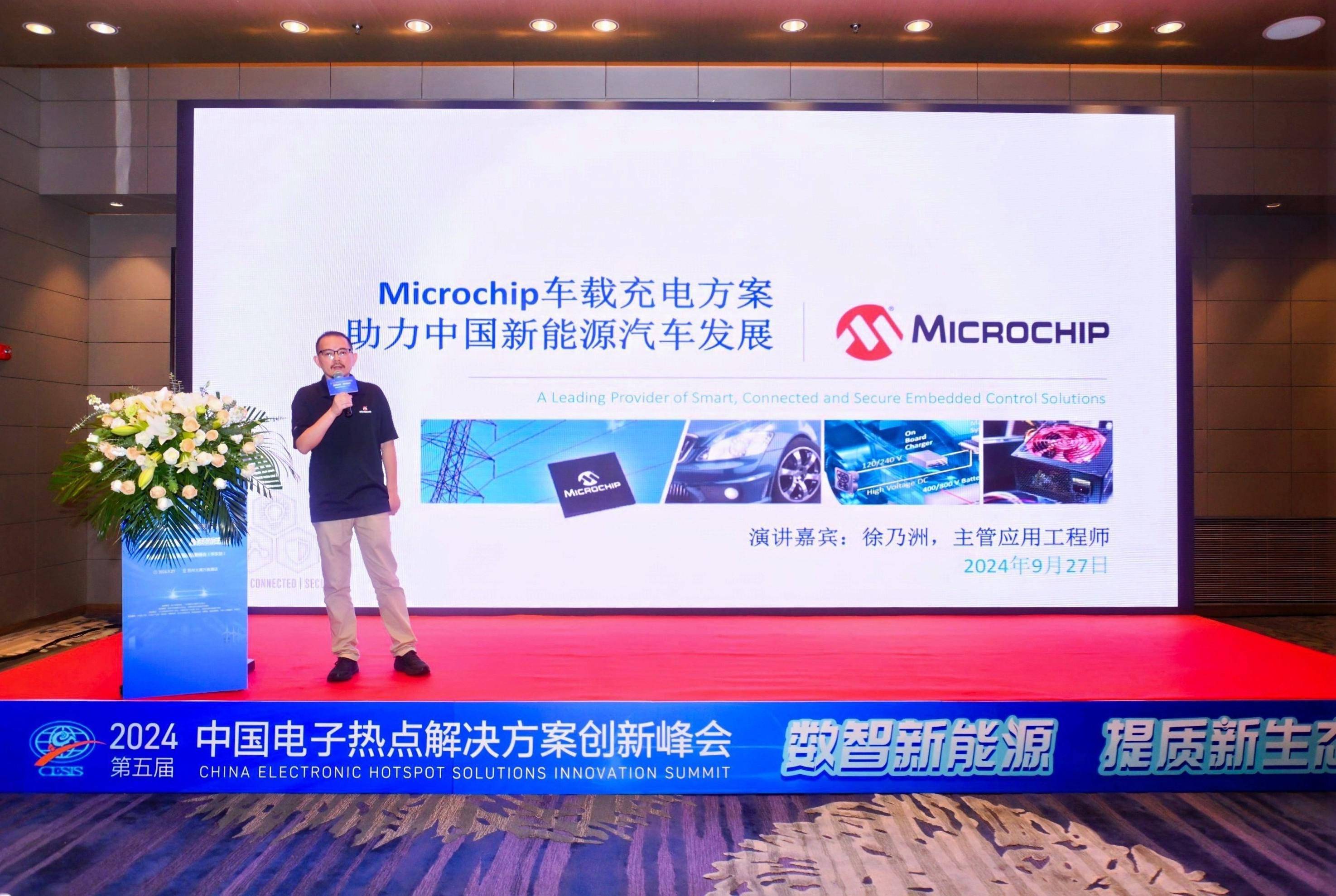 在峰會的演講廳,Microchip的主管應用工程師徐乃洲先生發表了題為《Microchip車載充電方案助力中國新能源汽車發展》的演講。徐先生詳細介紹了Microchip車載充電方案的優勢及其在推動中國新能源汽車發展中的重要作用。他的演講得到了與會者的廣泛關注和熱烈討論。