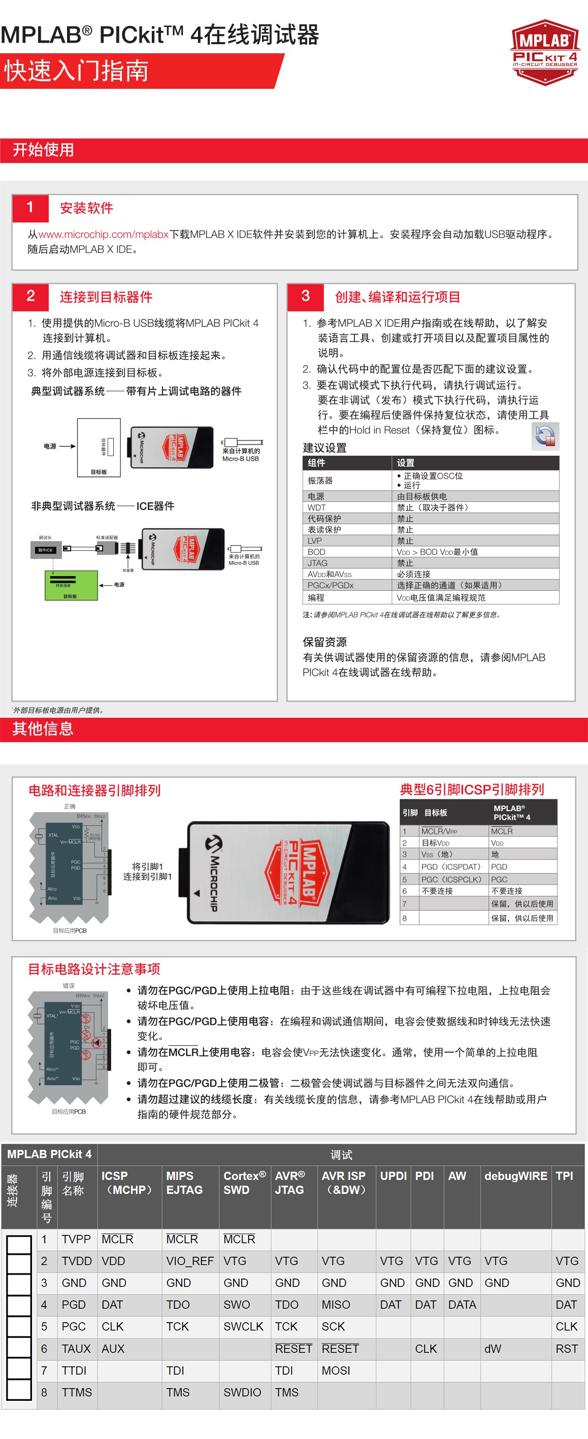 借助PICkit 4開發工具,設計人員可以使用MPLAB X集成開發環境(IDE)的圖形用戶界面來進行調試和編程。該工具使用高速USB 2.0接口連接至設計工程師的計算機,并通過可支持高級接口的8針單列直插頭連接至目標,此類高級接口包括4線JTAG和帶有流數據網關的串行線調試接口等。此外,它還可以向后兼容演示板、插頭以及使用2線JTAG和In-Circuit Serial Programming™(ICSP在線串行編程)的目標系統。